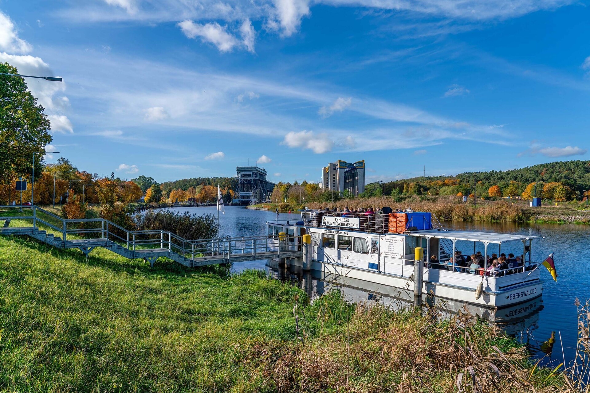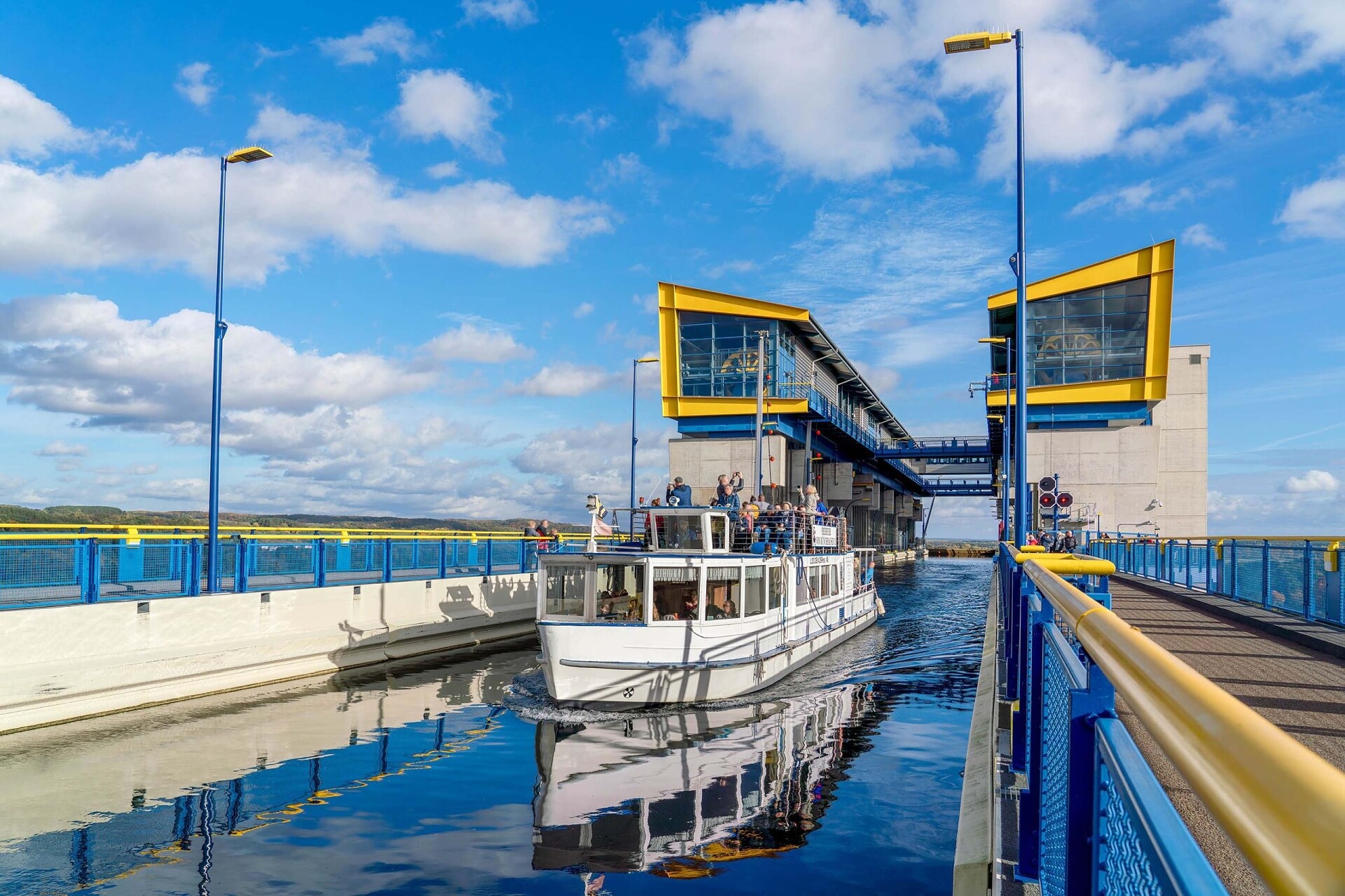 The Old Ship Lift from 1934—the oldest of its kind still in operation—and the ultra-modern New Ship Lift from 2022 together form a unique link in the European inland waterway network. From March to October, the passenger ships “Luise” and “Freiherr von Münchhausen II” offer regular scheduled trips.