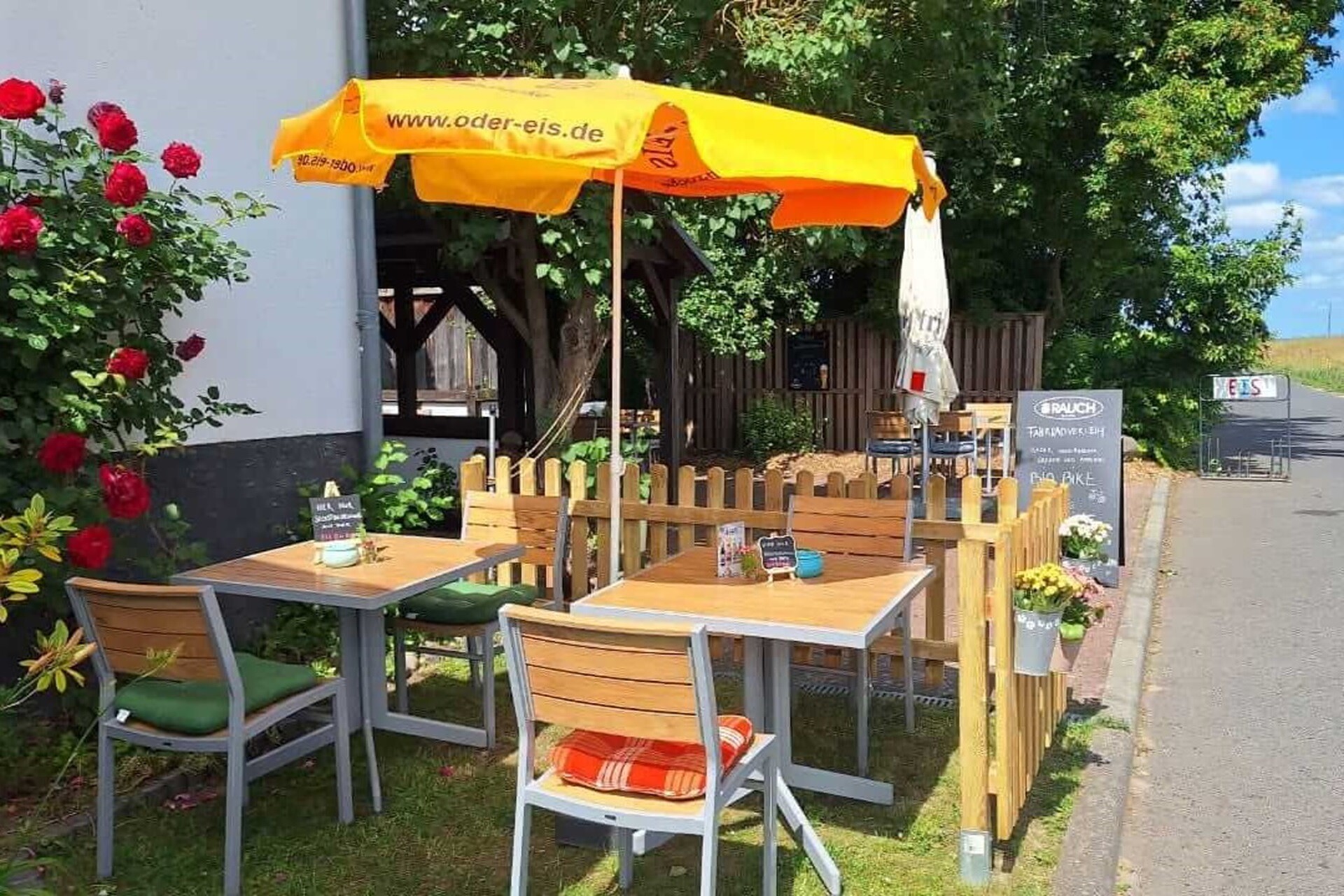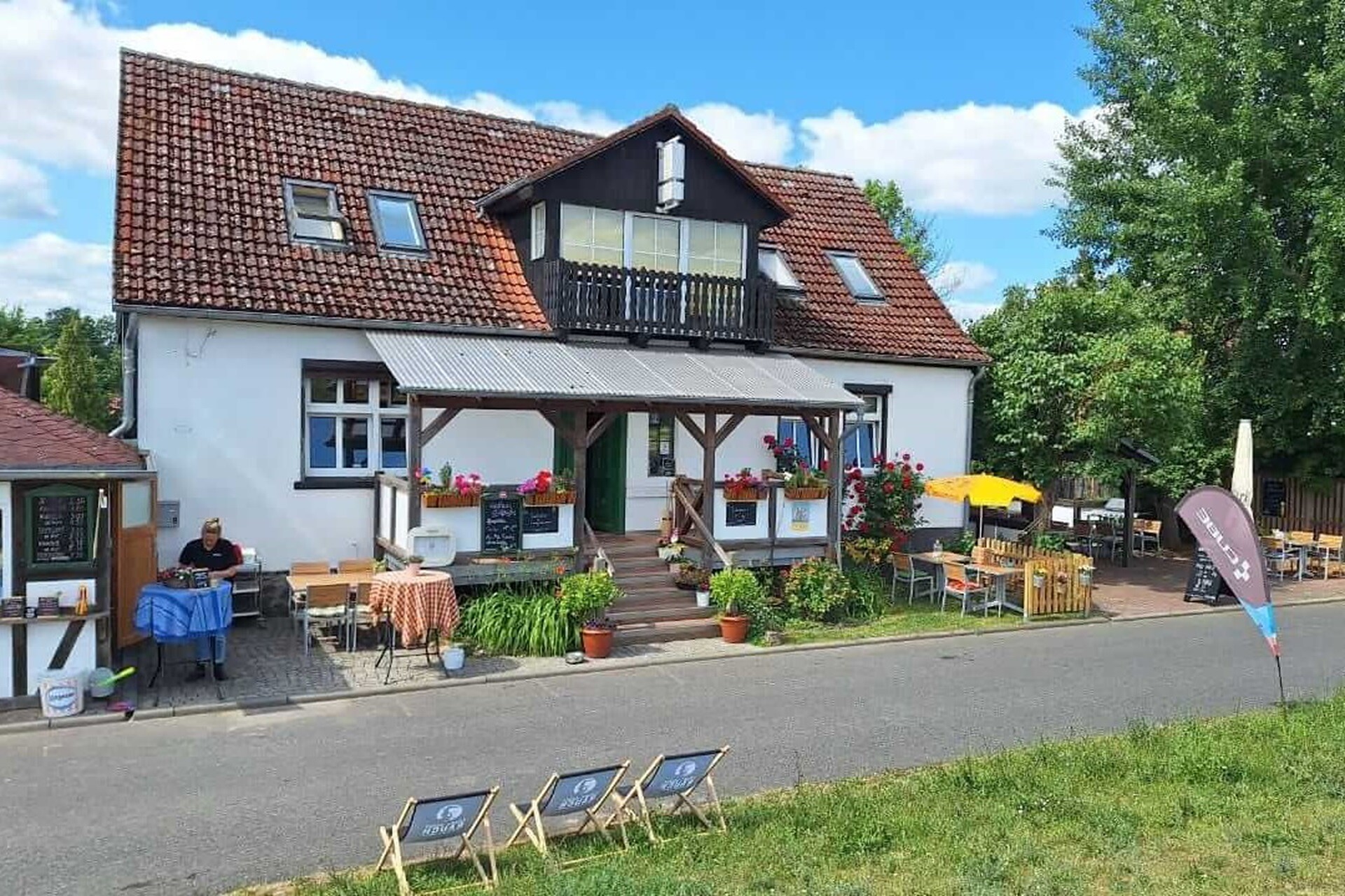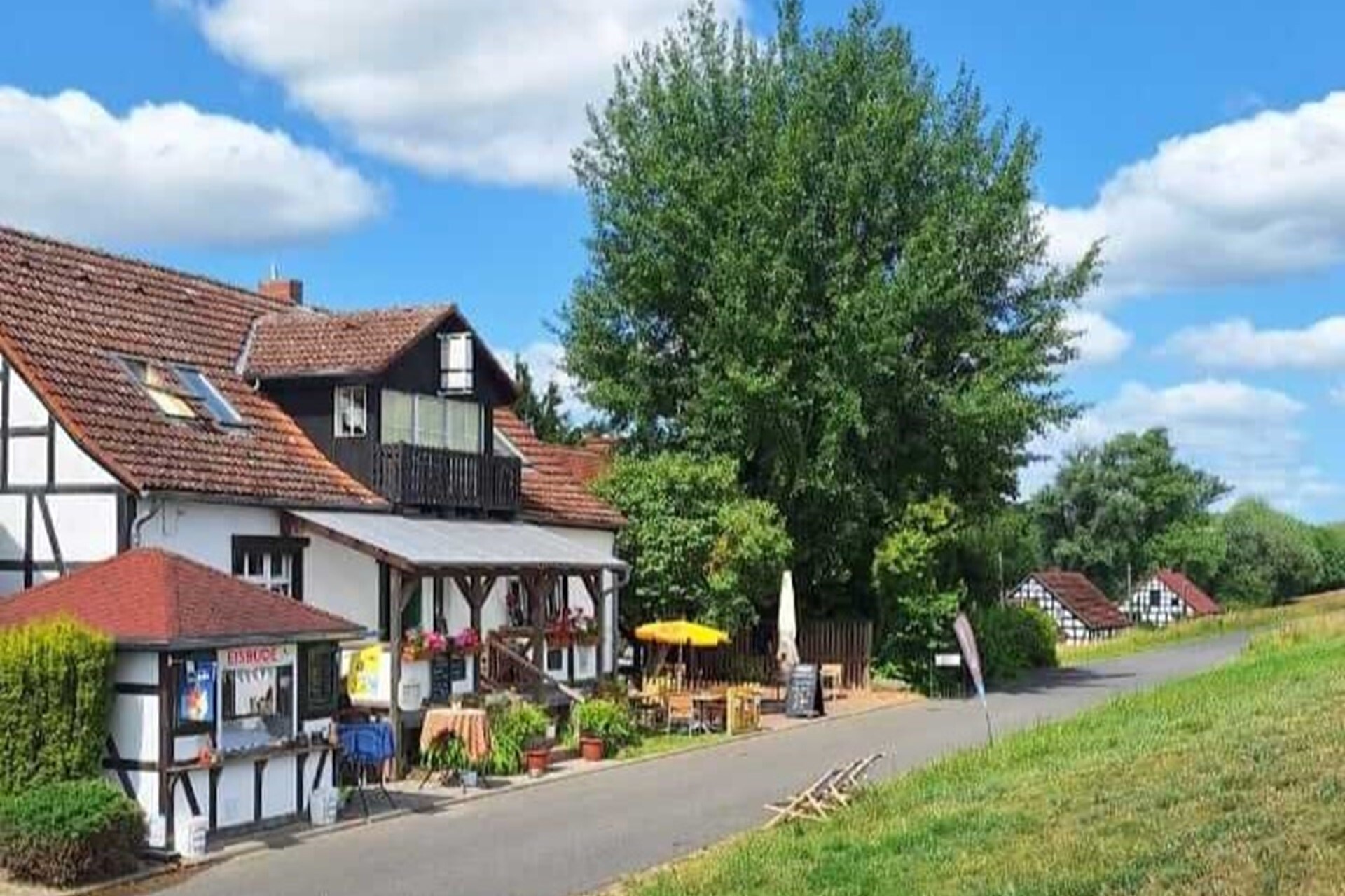 The restaurant in the quaint half-timbered house is located on the dyke at the end of the road to Zollbrücke. The Oder-Neisse cycle path runs right past the front door and entices many day trippers and cyclists to stop for a good meal or simply an ice cream at the ice cream stand in front of the house.