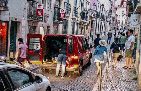 Denkmal, Auto, Straßenbau in alten europäischen Stadtkernen