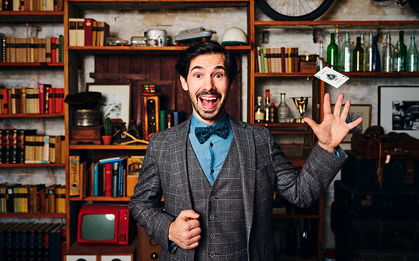 Was ist wahr, was Illusion? In seinem Programm „Wie ich nicht Zauberer wurde“ nimmt Sie **Alexander Merk** , deutscher Meister der Zauberkunst, mit auf eine humorvolle und magische Reise durch seinen angeblichen Werdegang zum Magier. Doch eines ist sicher: Die Geschichten, die er erzählt, sind genauso unerklärlich wie die Wunder, die er auf der Bühne vollführt.