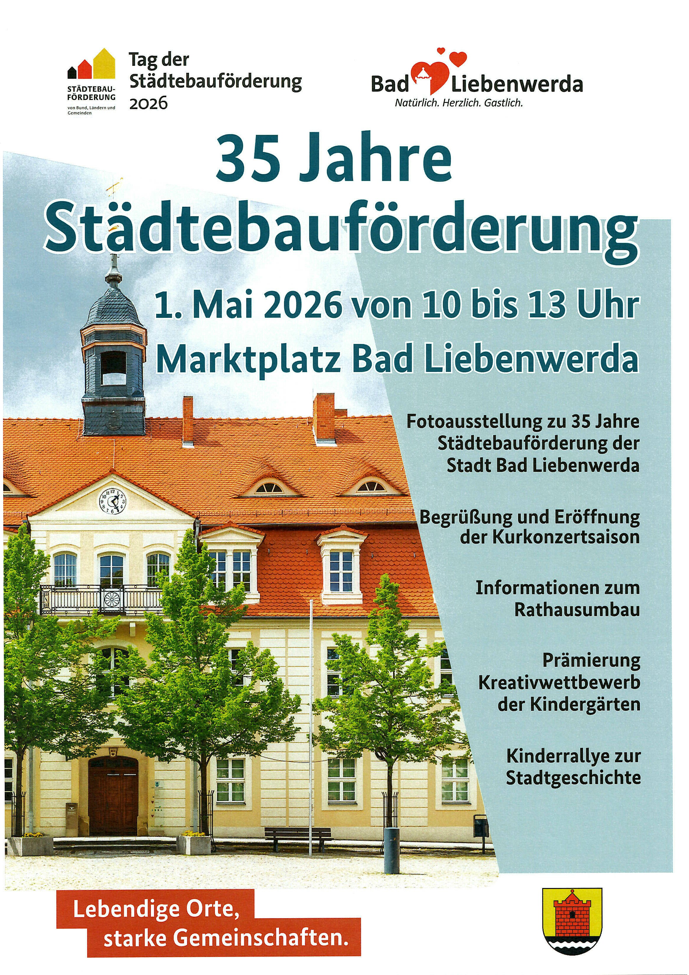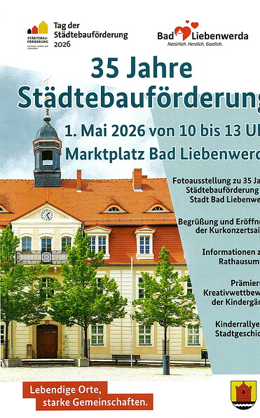 Am 1. Mai wird der Marktplatz in Bad Liebenwerda zum Treffpunkt für die ganze Familie: Von 10 bis 13 Uhr lädt die Stadt zum Tag der Städtebauförderung ein – eingebettet in das traditionelle Maibaumfest und die feierliche Eröffnung der Kurkonzertsaison.